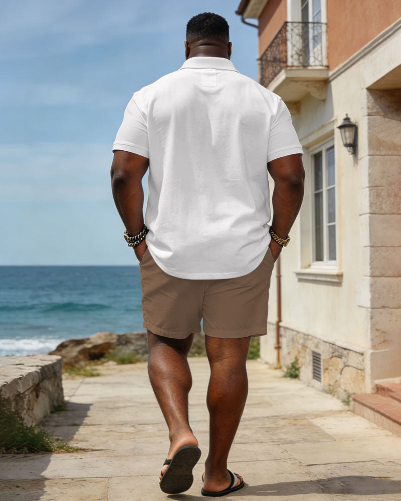Large Size Men's Spring And Summer Leisure Vacation White & Khaki & Black Contrast Color Stitching Chest Small Label Printed Short Sleeve POLO Shirt And Shorts Set